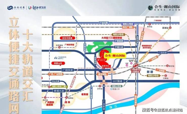 合生湖山国际坐落于增城新塘陈家林路,广园东板块,背靠陈家林自然保护区,东邻凤凰城,西靠陈家林路,南邻荔枝文化村,广深、广惠、广园高速、107国道交错,增25路公交3站无缝接驳地铁13号线。地处粤港澳大湾区C位,占位广州东TOD国际新城核心,九轨交汇连接处,湾区速度,随着新塘穗莞深城轨开通,公共配套的同城化,以及地价的水涨船高,项目潜力巨大。
