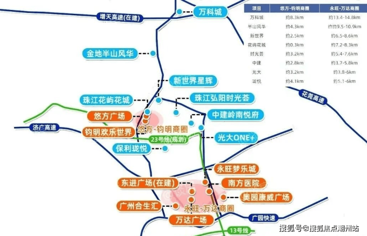 商业配套项目的商业除了依靠小区底商,周边还有一个是以合景悠方和钧明欢乐世界为主的商圈,另一个是以永旺梦乐城和新塘万达为主的商圈。