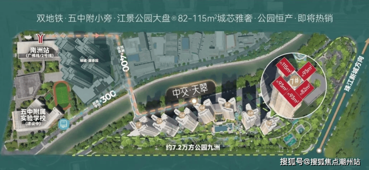 中交天翠位于海珠西部南洲板块,就在广州大道南和环城高速交汇处,所以项目自驾出行还是挺方便的,不过由于小区紧邻两条主干道,所以噪音和粉尘影响也基本少不了,项目距离地铁也不远。学铁商全能配套,北瞰广州塔,南望珠江水,居于公园中,兼具江景城景、园景。