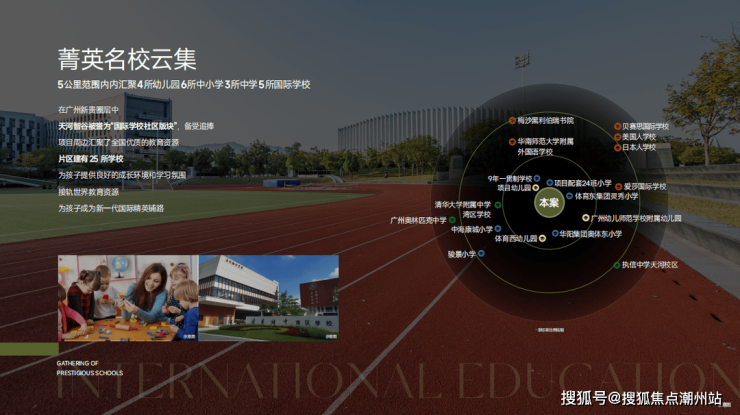 项目自配15班幼儿园和24班小学,其中24班小学引进广州天河外国语教育集团合作办学。广州天河外国语学校自2012年4月创办以来, 学校迅速成长为广州优质教育品牌;同时享有北京大学大学先修课程实施学校、广州市教育工作先进集体等多项称号。