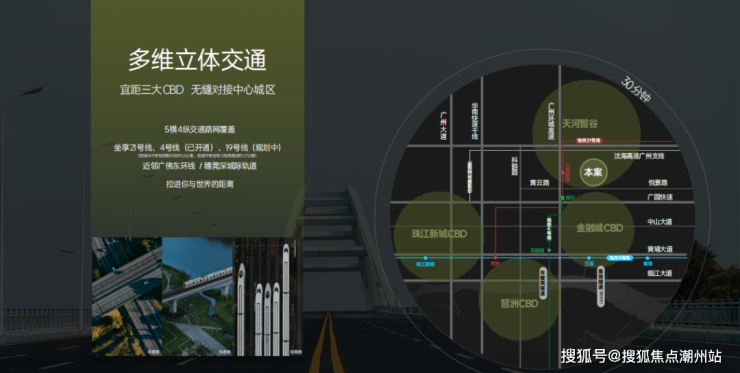 地铁:周边直线 3km 范围内有 4 个地铁站,分别为大观南路、黄村、神舟路、天河智慧城,距离最近的地铁站是大观南路,约 1.2公里。道路:拥有 5 横 4 纵交通网,悦景路已经拓宽至尾声即将通车,奥体北路延长线已通车,可实现 20 分钟通达三大 CBD,驾车出行较为便捷。