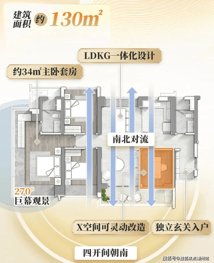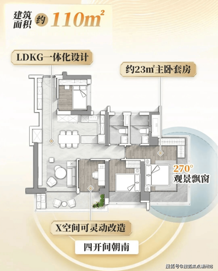 215㎡大平层,3梯3户,带超大入户前室,拥有约9.6米南向大景观阳台,和主卧270°观景飘窗,看园林景观。