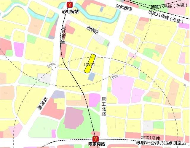地块距离彩虹桥地铁站或者陈家祠地铁站步行时间约6分钟,妥妥地铁盘。彩虹桥是11+8号线的双地铁,有环线在,