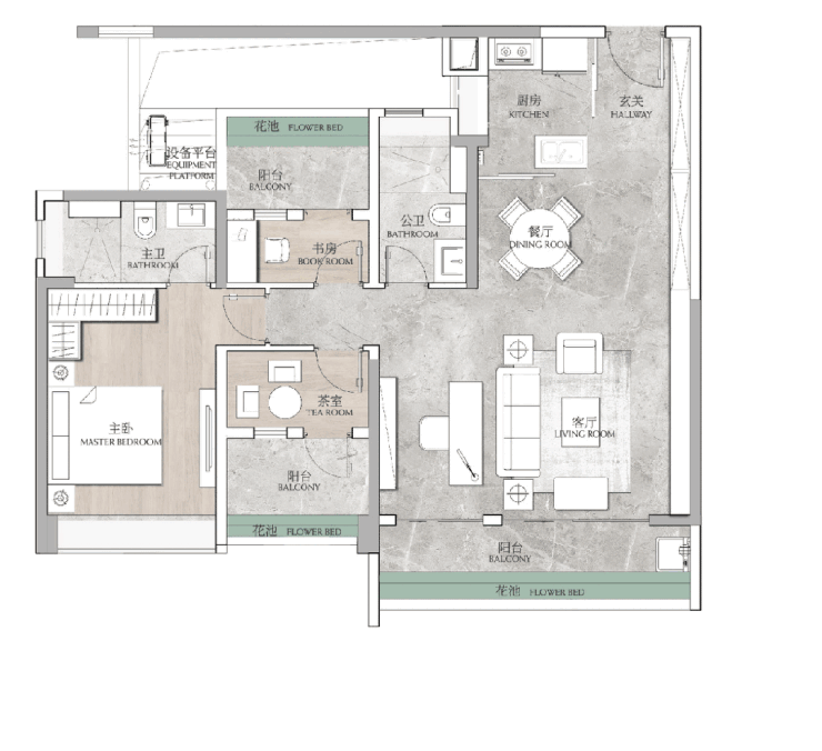 以主力户型约140㎡四房为例,该户型本身拥有约43㎡客餐厅,平时可用作家庭主人的超大公区空间。