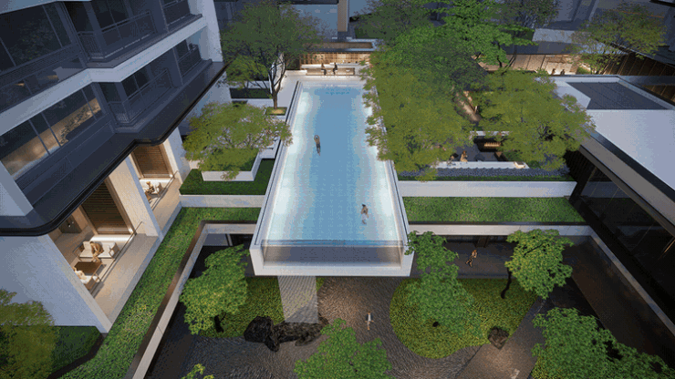 建筑、人与自然融合共生,打造双中心式生活院落,并以一廊五院的空间,营造出了粤式全龄生活功能圈。在家楼下,便能拥有与日常生活融为一体的休闲度假体验。