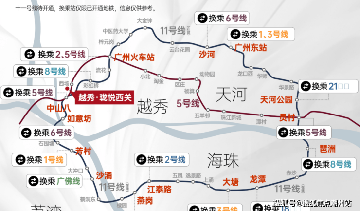 交通配套:可以算是三地铁交汇盘:距离5号线+13号线二期(在建中)西场站步行约700米,距离5号线+11号线中山八站约1公里。去琶洲、珠城、金融城、老海珠上班都能一线直达,非常方便。