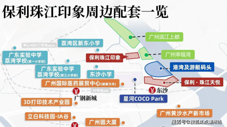 交通配套地铁:距离在建的地铁 10 号线东沙站约 700 米,预计 2025 年开通,开通后 4 站可达中大,6 站直达滨江东,零换乘直通珠江新城;1.3 公里处为已开通的地铁 11 号线环线,可快速通达中心五区。公交:1公里内有多个公交站,如健康港总站、沙洛市场等,满足日常居民的出行需求。自驾:白鹅潭大道连接十公里总部经济带,东沙大道、东沙隧道及丫髻沙大桥等正在建设中的交通基础设施将进一步加强该区域的交通连通性,自驾出行便捷,可快速连接广州多个主要交通枢纽。水上交通:规划有内港湾码头和水上巴士,未来将为居民提供独特的滨水出行体验。