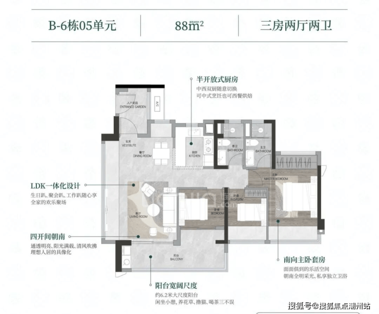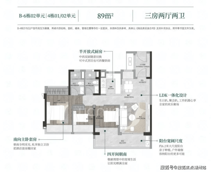 项目主打 88/89/106/108/125㎡的全南向三四房,首推6号楼 88/89㎡三房和 106/108㎡的四房。不过即使这 88㎡小三房:阳台居然有 6.2米开间,相当于别人家 120㎡的配置。最绝的是能隔出四开间朝南小户型也能享受大采光。