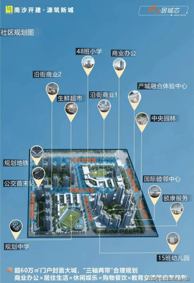 项目教育配套:项目自建15班幼儿园、48班小学、36班中学,以及广州市明贤科学高级中学(预计2025年9月开学),实现从幼儿园到中学的一站式公立教育,且计划引入广州大学附属学校等名校资源。
