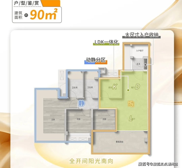 建面约90平三房为例,这是一个“小而美”的典范。做到了四开间朝南,主卧还配有270°环幕视野,在同等面积段内,绝大多数产品只能保证三开间朝南。
