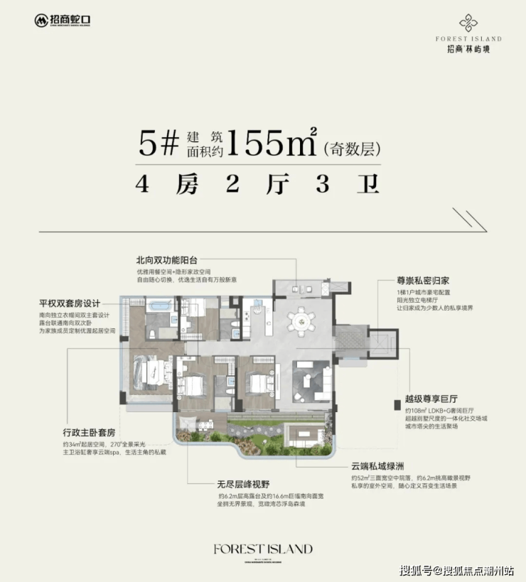广州南沙招商林屿境为粤港澳大湾区首个“超新规四代宅”,以155㎡空间融合大平层与别墅意境,主打精装修,交通便利,配套完善。