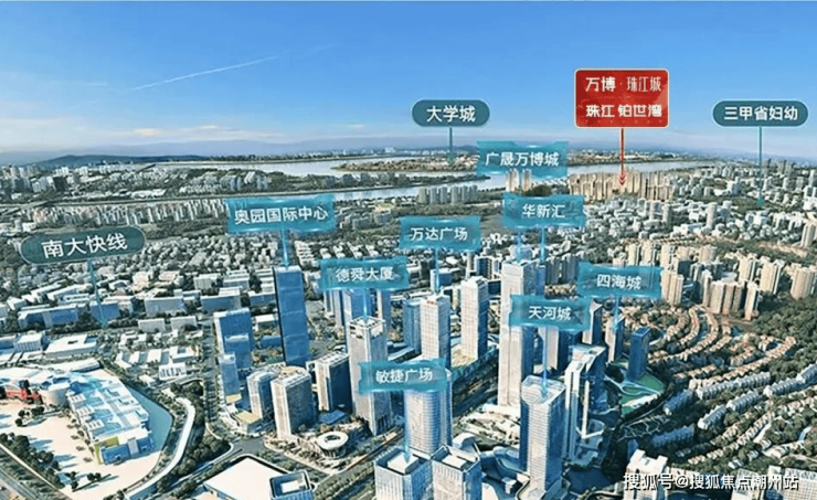 项目位于江山高尔夫俱乐部东侧,地处广州城市中轴&南大干线经济带双中轴交汇点,屹立于万博CBD唯一的滨江带上,“CBD城市顶尖资源+景观顶尖资源”的王牌资源在此双向奔赴,演绎珠江上的伟大重逢。项目超300万㎡产城融合代表作,重点布局“住宅-商业-产业-交通-教育-生态”6大领域,以8大价值打造宜居、宜游、宜业的理想幸福之城。