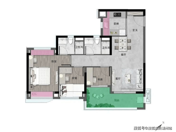 户型鉴赏:75㎡三房卫,四开间朝南,约5.2米大阳台,超10米南向展面。