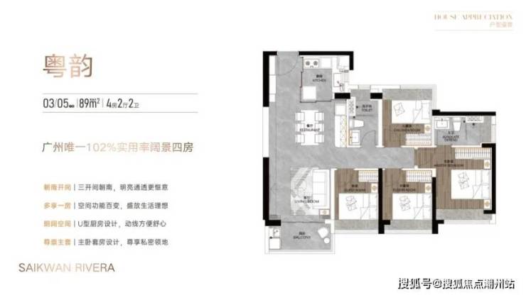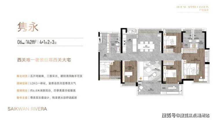 142㎡五房总价约 852 万起,四开间朝南的格局让室内日照充足,7 米长大阳台连通客厅和次卧