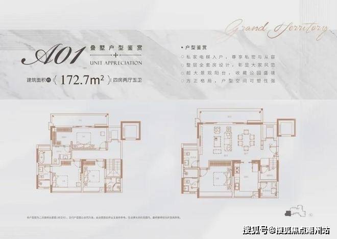 叠墅总层高6层,叠墅面积约168-215㎡分为上、中、下叠三户