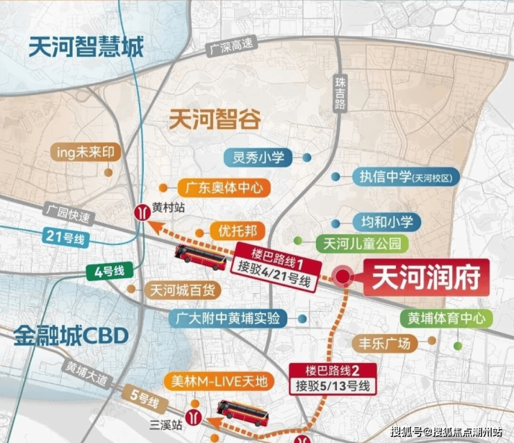 交通配套:华润天河润府配建一个公交站场,最近的地铁黄村站大概3.3公里。附近项目后期会配建规划道路,拓宽茅岗路北延段,由原来的单向2车道拓宽成40米双向6车道。另外项目有配建楼巴,从交付起5年内业主免费使用路线1:直达奥体中心,接驳地铁4/21号线黄村站,通达天河东/黄埔核心。直达鱼珠-三溪商圈,到地铁5/13号线鱼珠站,实现3站金融城,7站珠江新城。