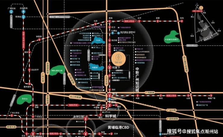 1公里范围内,聚集了地铁14号线何棠下站,绿地缤纷城、城南邻里中心、第二邻里中心等商业,中山大学附属肿瘤医院,广州知识城腾飞园、中新智慧园、国际科技中心等产业园区。