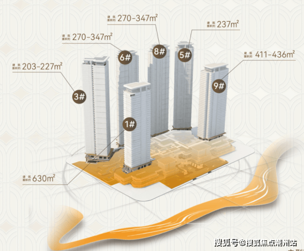 1号楼和9号楼的位置最好, 所以面积最大。其中1号楼是楼王,面积达到630㎡。9号楼的面积次之,在411-436㎡之间。另外,6号楼和8号楼的面积在270-347㎡之间。3号楼面积最小,203-227㎡之间,所以主力户型为237-347㎡。