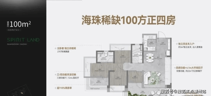 建面约100㎡ 四房两厅两卫;海珠唯一 100方内正四房,LDKG+X一体化 4.1m方正巨厅 ;约7.2m大平层级阳台,独立主卧套 灵动四房 270°转角飘窗全景广角视野。