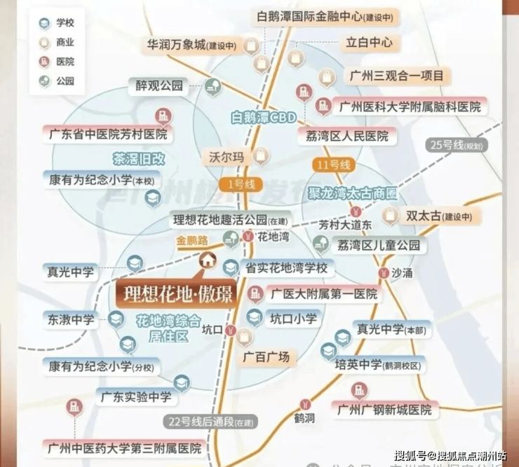 傲璟位于荔湾区花地湾商务组团,是万科理想花地新组团的核心位置,距离白鹅潭CBD约2公里,与聚龙湾双太古(在建)直线距离仅1公里。根据《荔湾国土空间总体规划(2023)》,白鹅潭被定位为“广州西岸CAZ黄金三极”之一(另两极为珠江新城、金融城),目标打造“产商住一体新城市中心”,对标纽约哈德逊广场、伦敦国王十字等国际地标。
