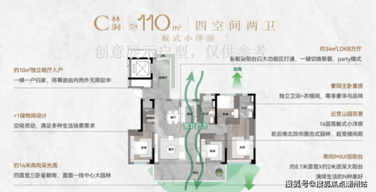 110㎡四空间,专梯入户,四开间朝南,南北双向围合式园林景观,更有超大LDKG空间,一键切换聚餐、party模式。并且,南向双主套,做到生活平权。