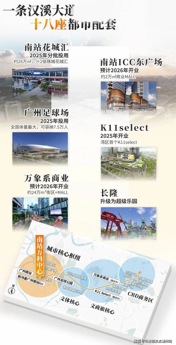商业配套:沿着汉溪大道,18座地标级配套群星闪耀,进一步改写片区生活剧本。容纳约7.5万人,全国最大的足球场今年兑现后,不管是看演场会、看比赛,还是运动踢球、专业集训,都能在家门口解决。南站ICC、花城汇、喜街、K11select、万象系,密如蛛网的地标商业,带来世界级地标商圈配置,出门就是逛不完的高端商业。 从南站到足球场,再到长隆万博,一站式的枢纽、文体文旅、商圈等资源紧密咬合,自由流动。