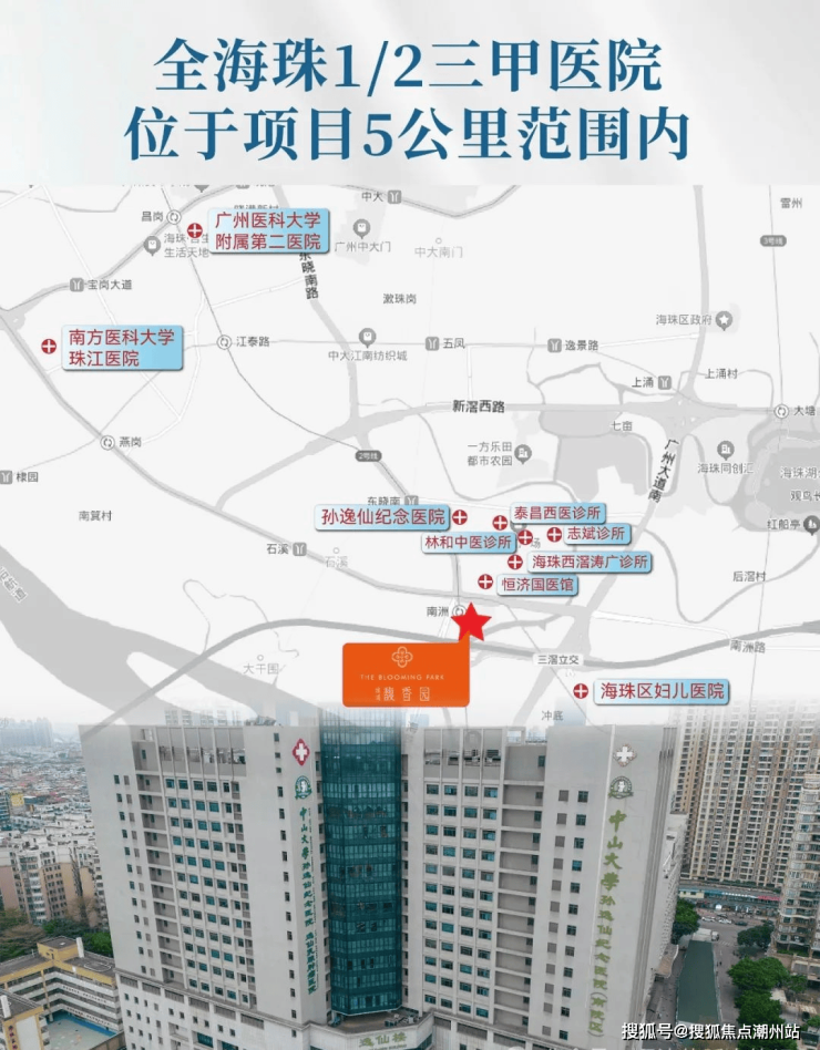约750米中山大学孙逸仙纪念医院(三甲)约1.5公里海珠区妇儿医院约3.5公里南方医科大学珠江医院、广州医科大学附属第二医院。