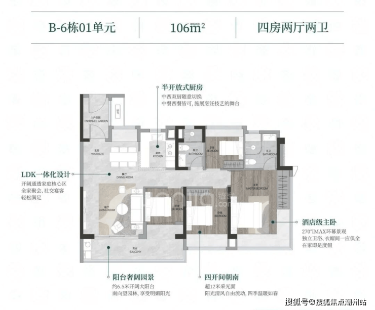 106㎡三房: 6.5米阳台+入户花园,使用率超110%。按新规设计,实际使用面积比同面积旧规户型多 10㎡左右。