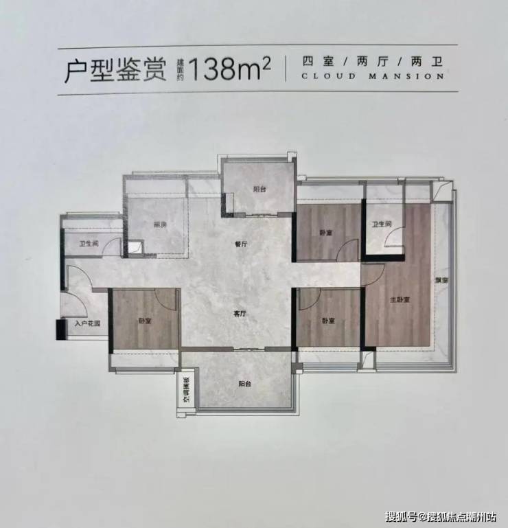 建面约106方,东南朝向四房设计,可以看白云山。做了飞机户型, 主人房和一个次卧能做到270°的大飘窗,景观面更宽。