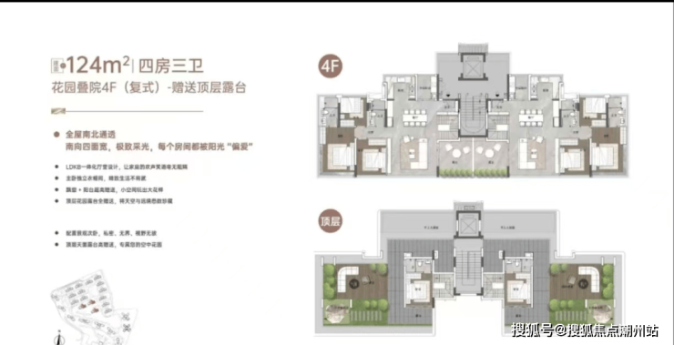 这是最接近墅级形态的户型,下层做了侧花园设计,顶层的天面露台全赠送,实现了约242%的使用率