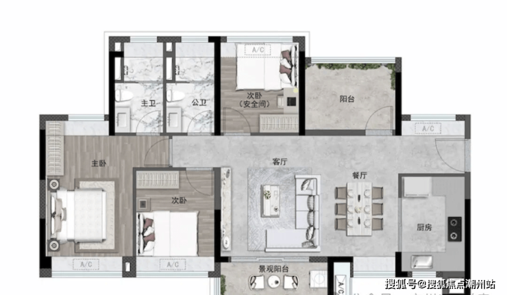 全屋多达6处飘窗赠送,主卧正面飘窗+转角飘窗、玄关飘窗、次卧飘窗、公卫飘窗