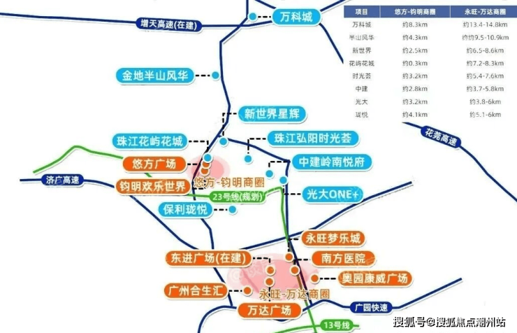 商业配套项目的商业除了依靠小区底商,周边还有一个是以合景悠方和钧明欢乐世界为主的商圈,另一个是以永旺梦乐城和新塘万达为主的商圈。