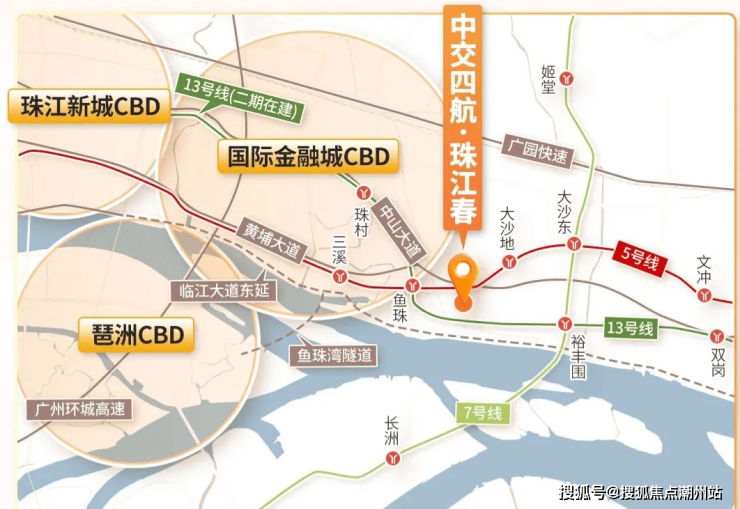 广州中交四航珠江春项目位于黄埔区鱼珠核心板块,地理位置优越,项目紧邻珠江,与珠江距离约200-300米,拥有630米南向江景资源,是老黄埔距离天河金融城最近的江景盘,距离港航大厦直线距离仅约800米,5号线鱼珠与大沙地之间,是老黄埔旧改中最靠近天河的项目。周边已落地广州国际智谷、粤开资管大厦等重点项目,未来产业配套完善。