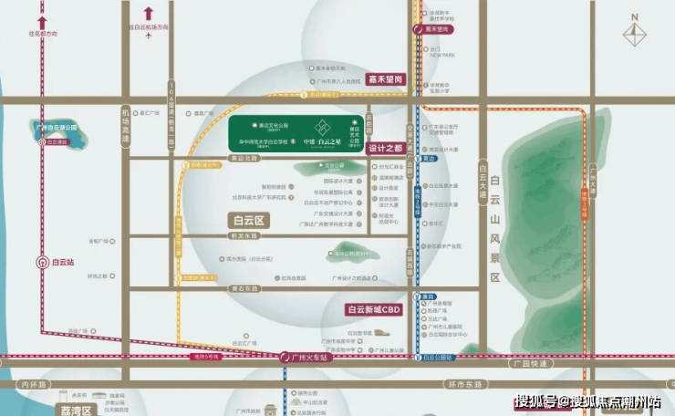 中建.白云之星位于设计之都板块,就在时代玫瑰园二期的西侧,这块地是属于白云黄边村旧改项目,总共分为16个地块开发,其中商品房有3-4-8号地块,目前在售的是8号地块,这期组团不算大,只有5栋楼,不过却是几个融资地块位置最好的,距离学校、地铁和公园都是最近的,这个盘的综合素质还不错,算是板块难得的学铁商纯改善大盘