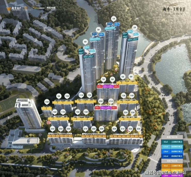 户型:小高层95㎡/125㎡三四房、超高层96㎡三房、125㎡/141㎡四房、底叠150-200㎡三四房