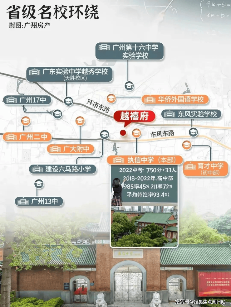 教育配套项目位于华乐街道优质教育圈,对口越秀区重点小学——建设六马路小学(参考往年招生政策)。根据2023年小升初政策,可参与10所优质中学摇号,其中包含6所省级名校: 执信中学本部(高考重本率99%,600分以上占比86%)、 育才中学(省重点示范校)、 华侨外国语学校(外语特色强校)、 第二中学(百年名校,升学率高)、 广大附中(教育部直属重点) 、十六中学(省一级名校)。