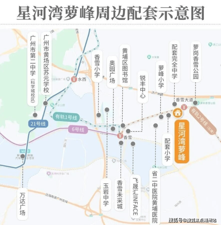 交通配套拥有双高速口(香雪收费站、萝岗收费站)、双地铁(6 号线香雪站、23 号线规划中)以及双有轨电车(1 号线、2 号线香雪大道站 / 玉岩站),构建了多维度的交通网络,30 分钟内可连接三大高速,快速通达全城。