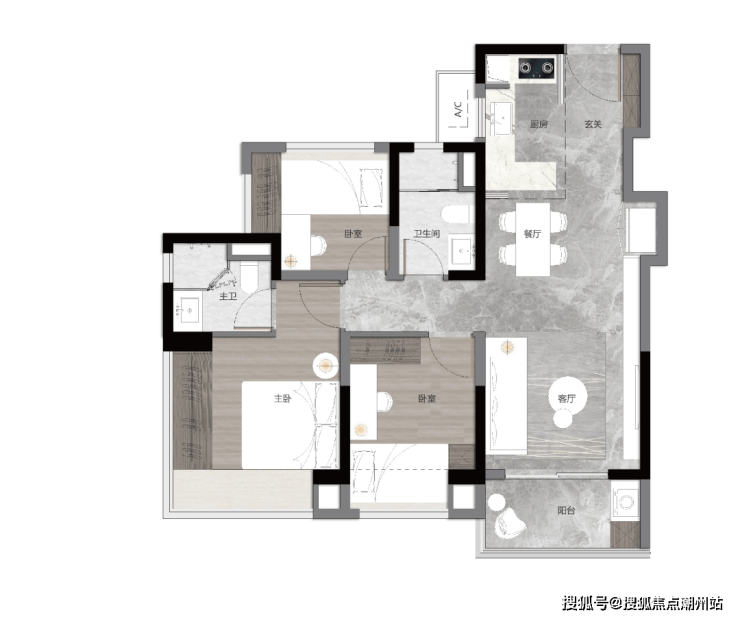 入户玄关,LDKB一体化设计,套房式主卧设计,刚需相当友好。