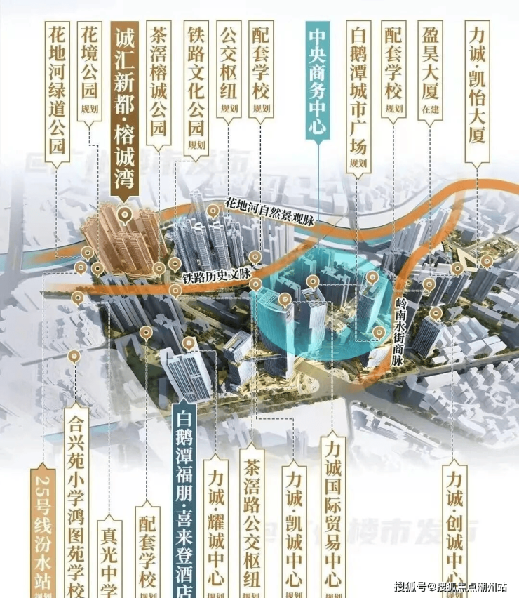 诚汇新都位于白鹅潭商务区核心区,涵盖35个地块,占地约54万㎡,总建筑面积超200万㎡,是主城罕见的大规模连片开发的城市更新项目。将新建16个高端住宅社区,2间学校和3间幼儿园,以及合计60万㎡高端商业。内部规划“一心三脉”四大组团,未来将打造成集总部办公、高端商业和生态人居为一体的都会生活3.0大城。