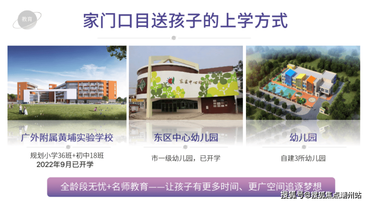 教育配套上 ,项目规划3所幼儿园,其中2所已建成(位于一期、二期)。中小学方面有自己配建的广东外语外贸大学附属黄埔实验学校(简称“广外附”)已于2022年9月1日正式开学(小学36班+初中18班),外有东区小学、初中配套等,形成从幼儿园到初中的 12 年教育链 ,为孩子成长提供有力保障 。
