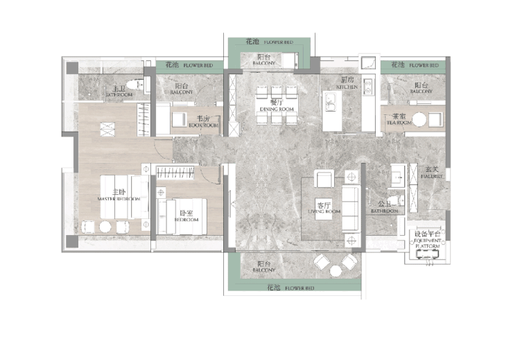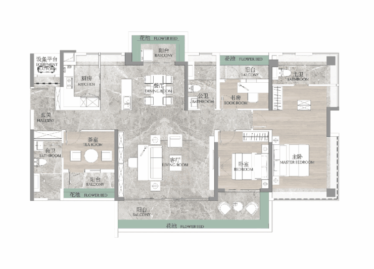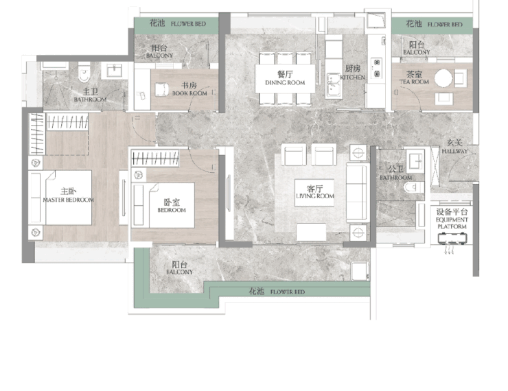 以主力户型约140㎡四房为例,该户型本身拥有约43㎡客餐厅,平时可用作家庭主人的超大公区空间。