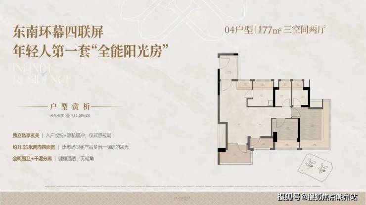 1核心亮点:片区稀缺80㎡以下三房两卫,带独立入户花园;四开间朝南,南向总面宽约11.35米,采光拉满;客厅开间约3.3米,主卧270°全景飘窗,两个独立明卫,无暗卫暗房,刚需户型做到改善质感