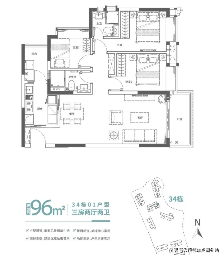 建面约96㎡滨水舒适三房,餐客厅一体化,连通观景阳台,臻藏生活美景,客厅与休息区以科学合理的布局分隔,动静皆从容,卧室均规划大面宽飘窗,放大房间尺度感,营造舒适生活体验。