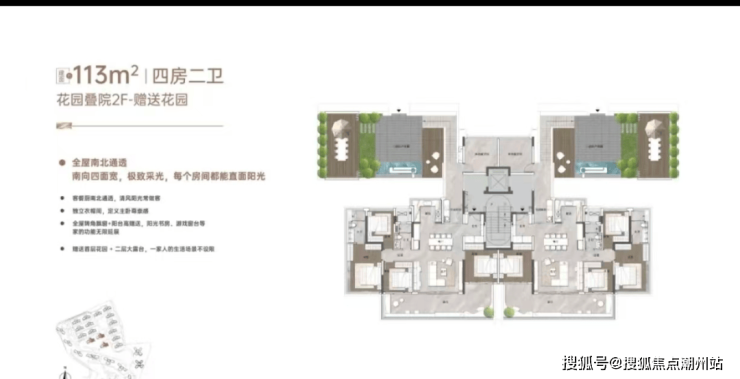 这是最接近墅级形态的户型,下层做了侧花园设计,顶层的天面露台全赠送,实现了约242%的使用率