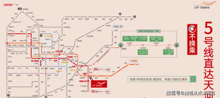 近5号线双地铁口,直达珠江新城:2地铁(5/13号线),5号线保盈大道、夏园站(已通车)无需换乘,直达珠江新城CBD;通过13号线夏园站,4站直达鱼珠CBD,5站到天河,二期开通后不换乘直达珠江新城。
