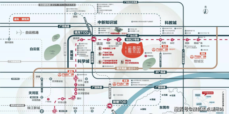 金科景业瀚景园项目是金科集团和景业名邦两大房企联手打造的产品,位于增城广汕公路地铁21号线坑贝站B出口(直接距离地铁站100米约之内)未来还有地铁27号线在此经过,可谓是真正的地铁盘!此外,项目周边还有广园快速、花莞高速、广河高速、增天高速(规划中)等多条高速路环绕,整体交通条件还算便利。教育配套是另一大亮点,华南师范大学附属汇政双语学校以开学,位于项目东南侧直线距离仅约100m。