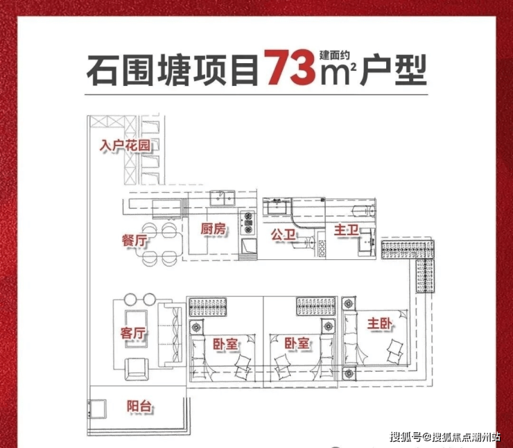 另一个户型则是单边位,做到南北对流;且主卧观景面、采光面更广,是小户型难得的U型采光。
