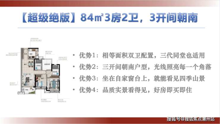 建面约84㎡带主套宜居“2+1”户型,生活从容自得,南向望园林;带主套,双卫设计,满足三口之家的幸福生活。