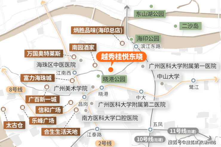 交通配套:距离地铁8号线晓港地铁站仅0.6km,8号线可以直达琶洲、客村等商务圈,一站到昌岗可以换乘2号线,到南站、白云新城也比较方便,三站客村换乘3号线,到珠江新城、体育西路,能实现40min内通勤。