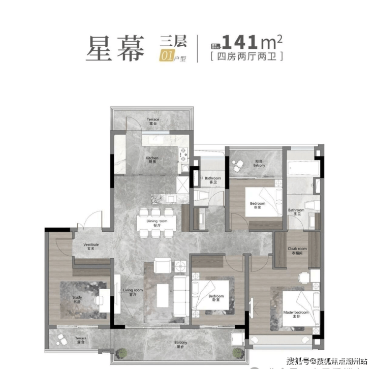 141平是小洋楼全为板式设计,梯户比为一梯两户,相当于专梯入户,拥有独立电梯间,每一户都带有超长观景阳台,100%南向设计,四开间朝南,拥有同类型产品里最大的采光面。